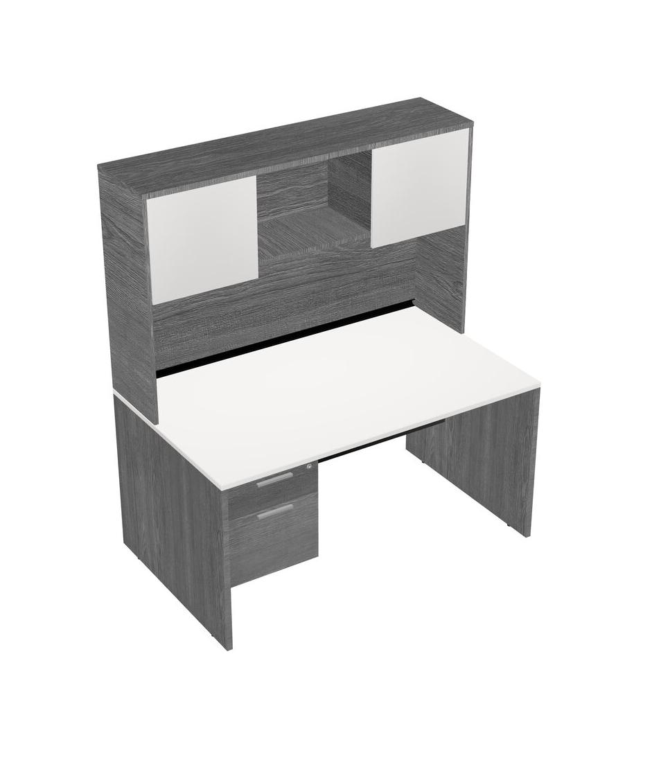White Rectangular Office Desk Plus Grey Hanging Drawers And Grey Hutch