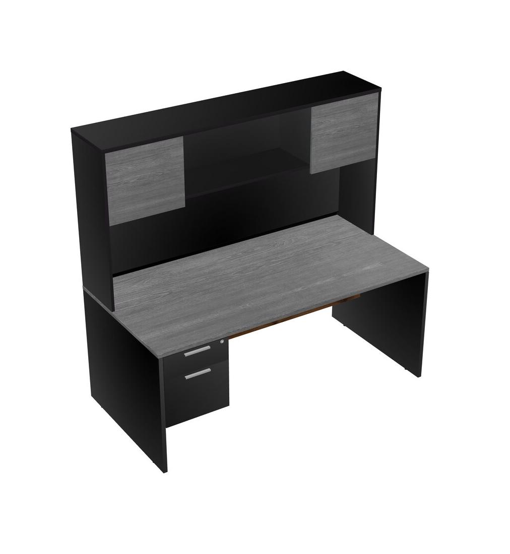 Grey Rectangular Office Desk Plus Black Hanging Drawers And Black Hutch
