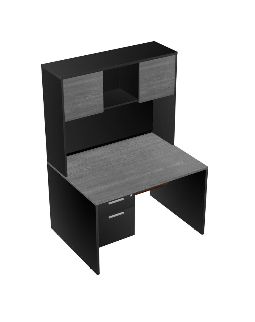 Grey Rectangular Office Desk Plus Black Hanging Drawers And Black Hutch