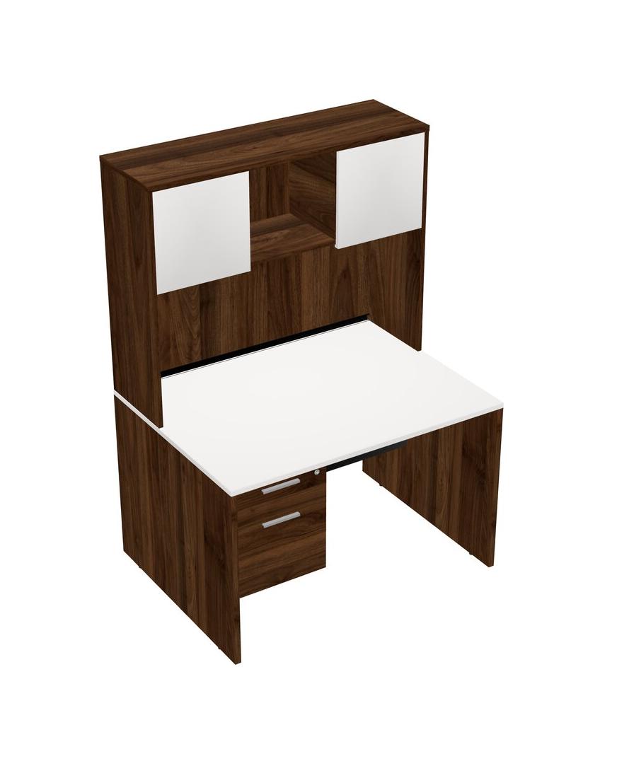 White Rectangular Office Desk Plus Columbia Walnut Hanging Drawers And Columbia Walnut Hutch