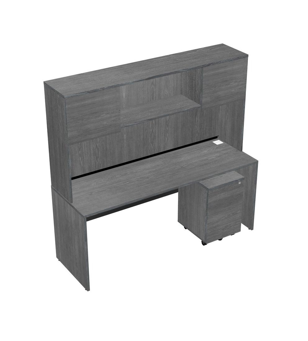 Grey Rectangular Office Desk Plus Grey Wooden Mobile Drawers And Grey Hutch