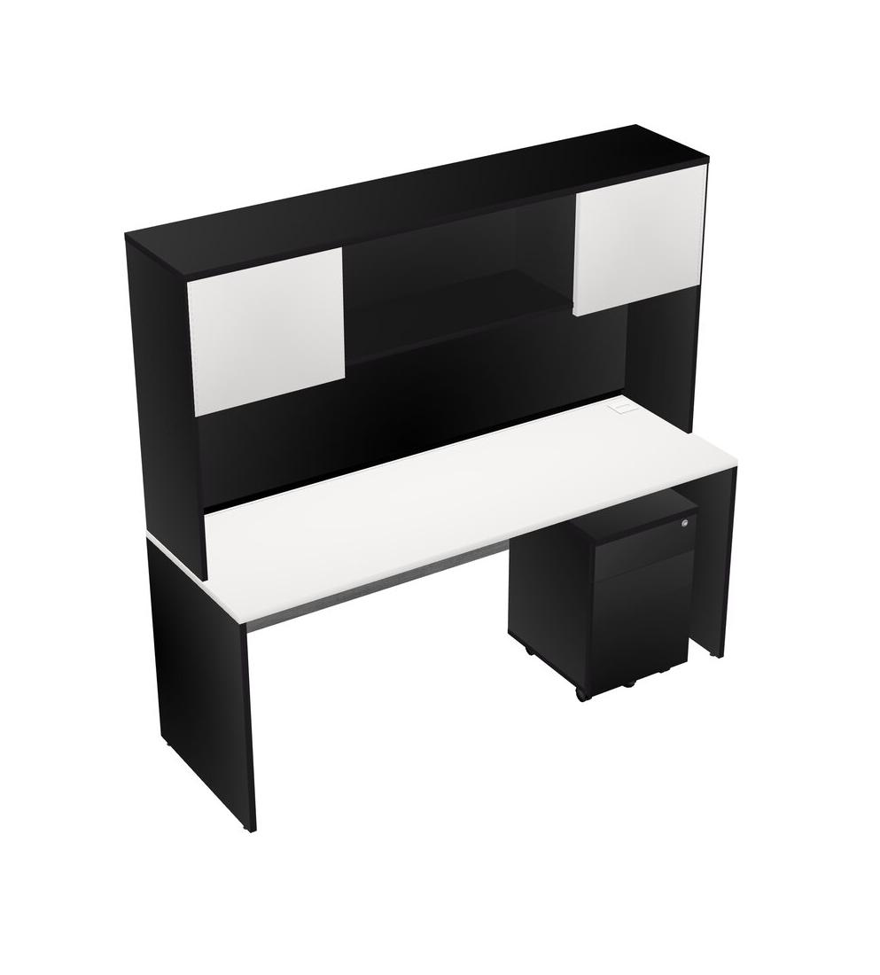 White Rectangular Office Desk Plus Black Wooden Mobile Drawers And Black Hutch