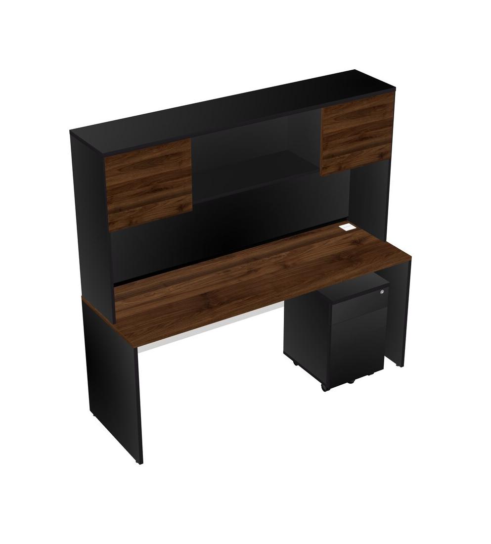 Columbia Walnut Rectangular Office Desk Plus Black Wooden Mobile Drawers And Black Hutch