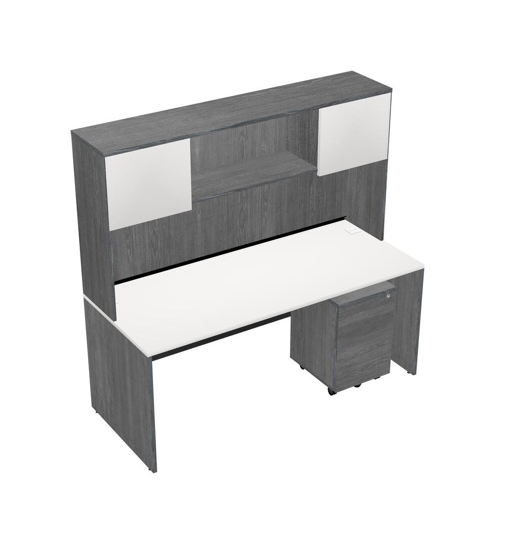 White Rectangular Office Desk Plus Grey Wooden Mobile Drawers And Grey Hutch