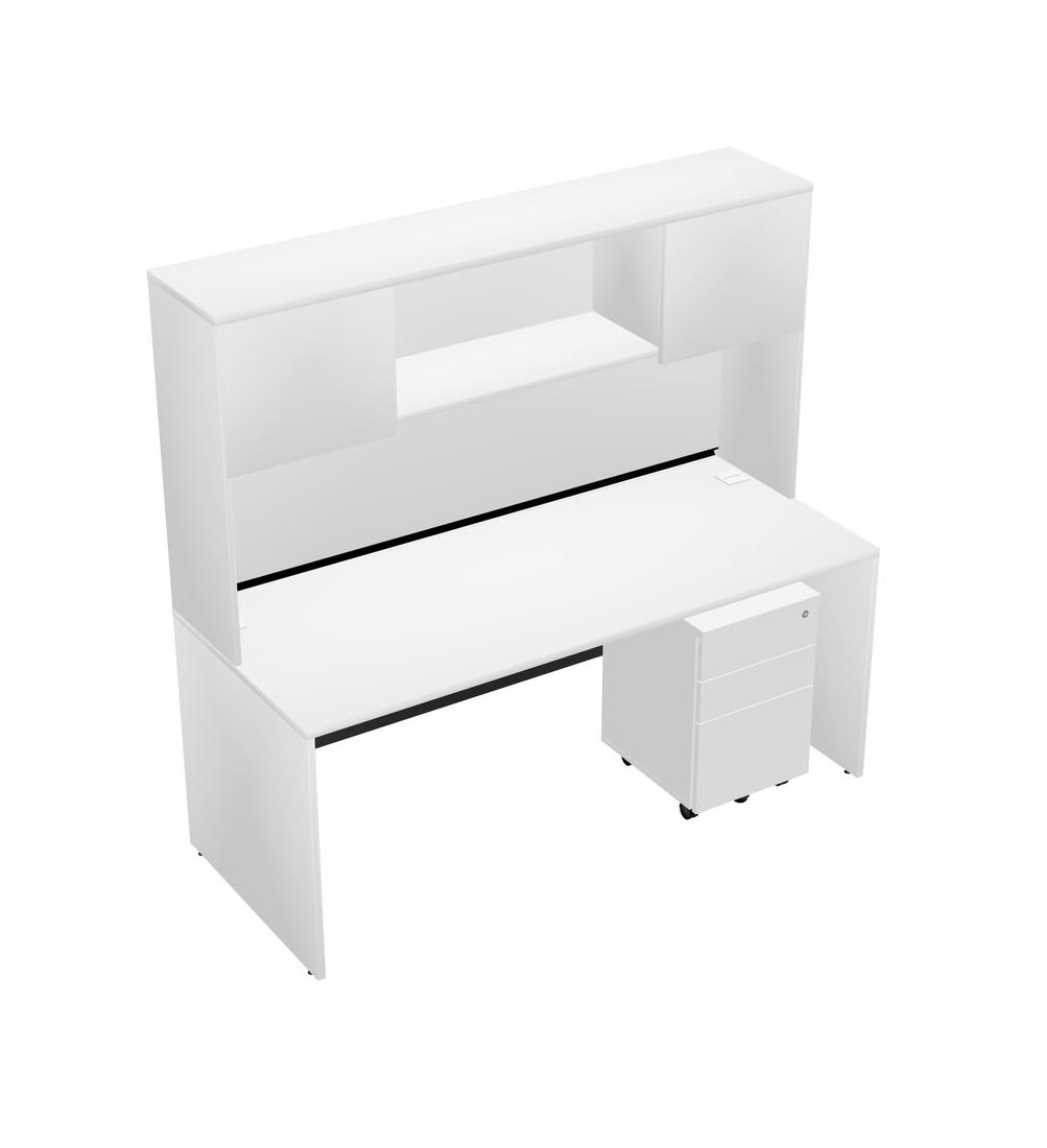 White Rectangular Office Desk Plus White Wooden Mobile Drawers And White Hutch