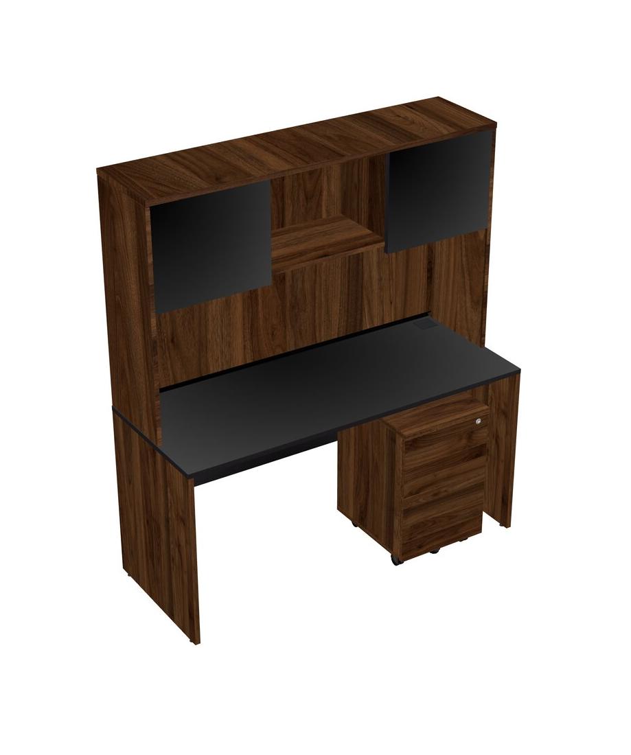 Black Rectangular Office Desk Plus Columbia Walnut Wooden Mobile Drawers And Columbia Walnut Hutch