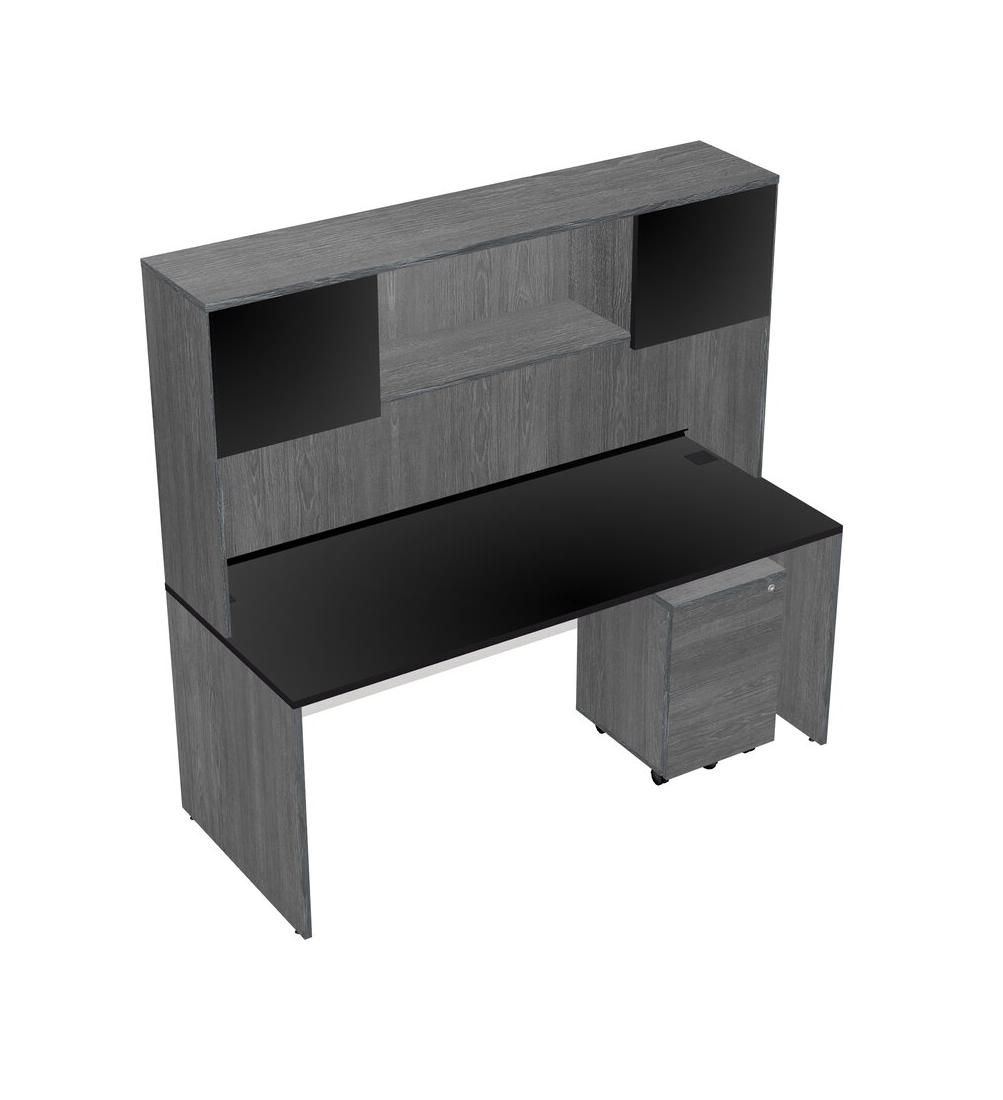 Black Rectangular Office Desk Plus Grey Wooden Mobile Drawers And Grey Hutch