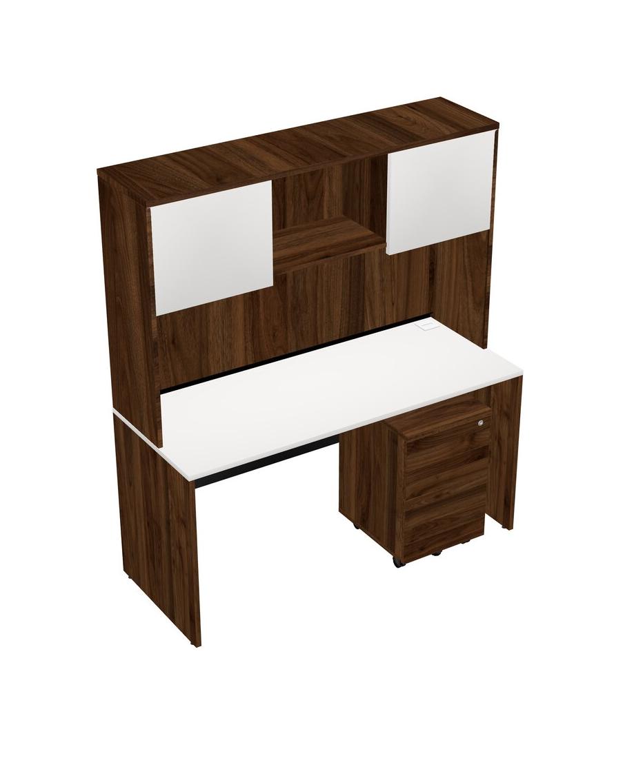 White Rectangular Office Desk Plus Columbia Walnut Wooden Mobile Drawers And Columbia Walnut Hutch