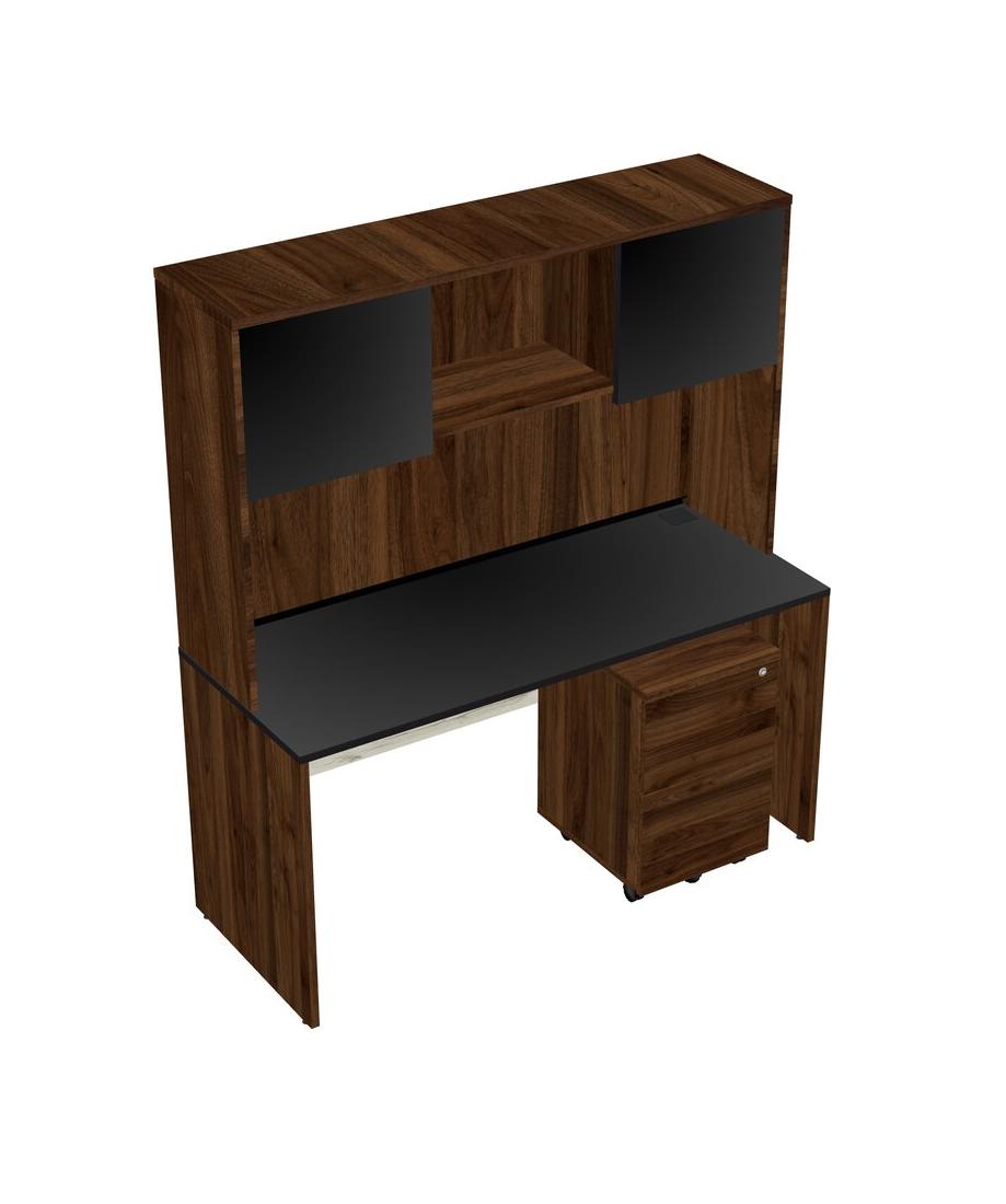 Black Rectangular Office Desk Plus Columbia Walnut Wooden Mobile Drawers And Columbia Walnut Hutch