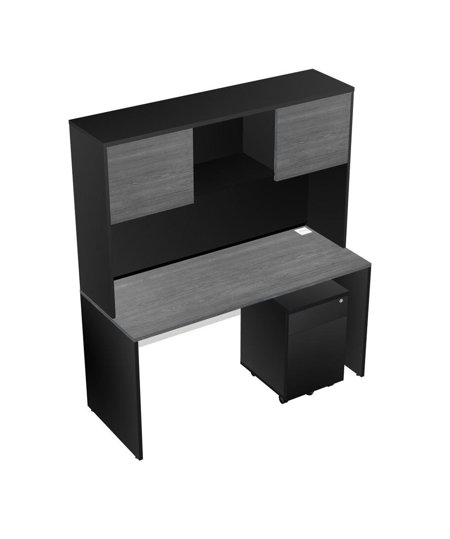 Grey Rectangular Office Desk Plus Black Wooden Mobile Drawers And Black Hutch