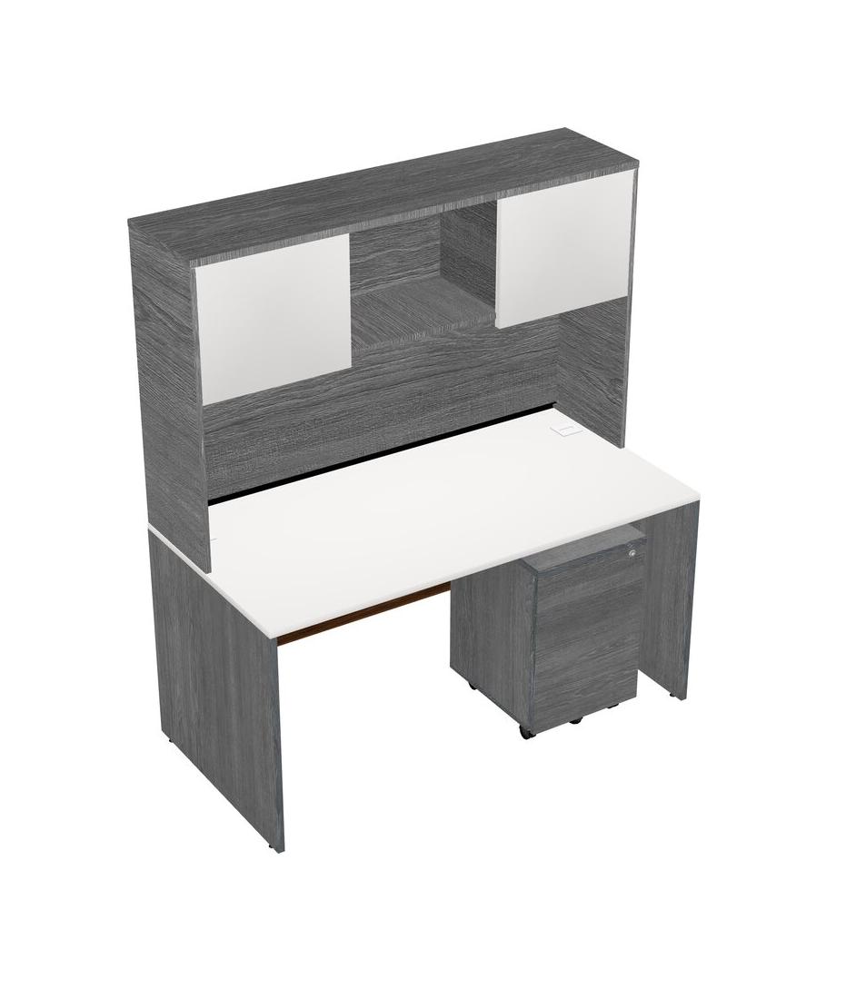 White Rectangular Office Desk Plus Grey Wooden Mobile Drawers And Grey Hutch