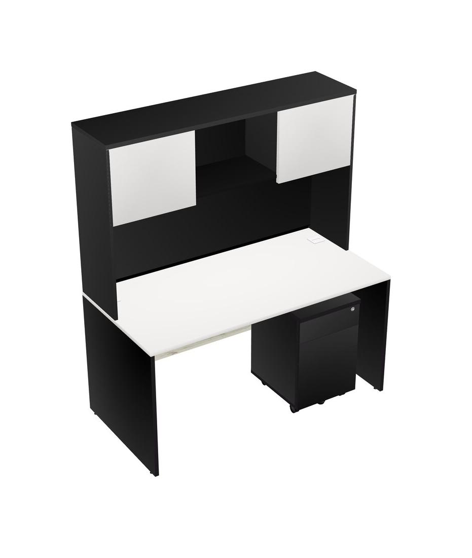 White Rectangular Office Desk Plus Black Wooden Mobile Drawers And Black Hutch