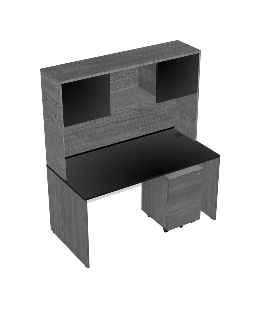 Black Rectangular Office Desk Plus Grey Wooden Mobile Drawers And Grey Hutch