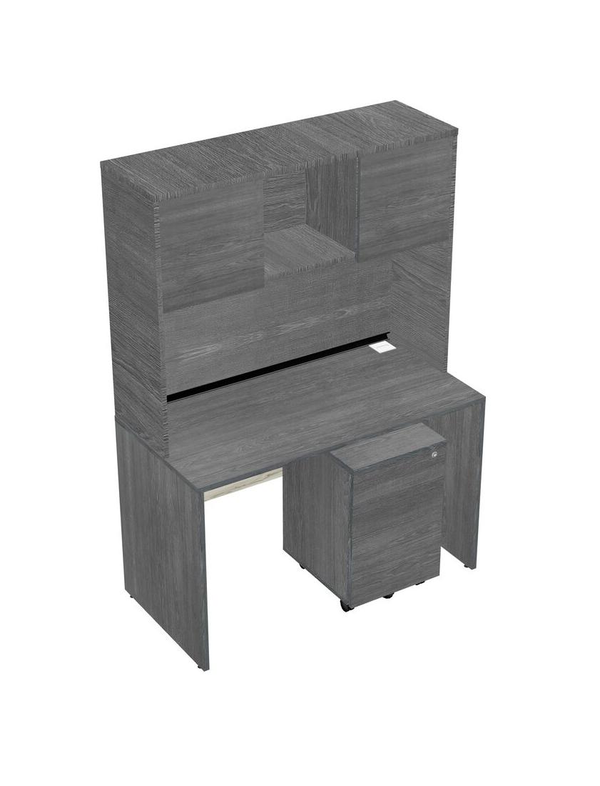Grey Rectangular Office Desk Plus Grey Wooden Mobile Drawers And Grey Hutch