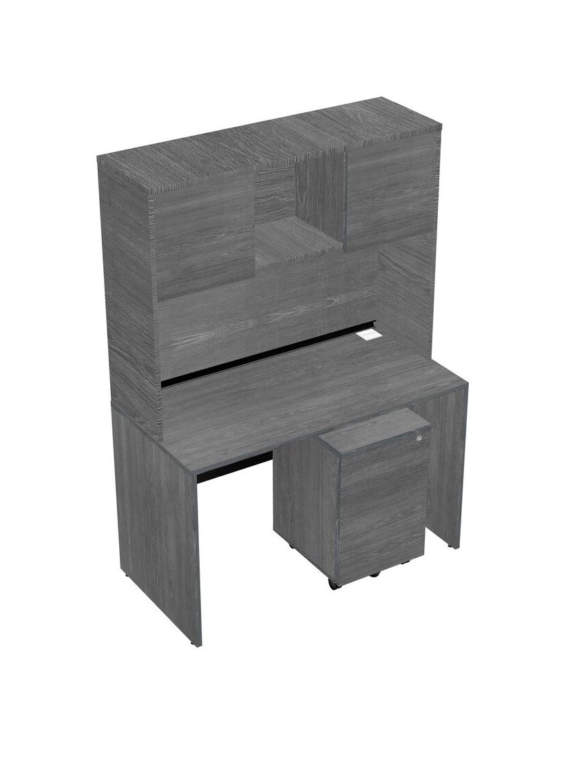 Grey Rectangular Office Desk Plus Grey Wooden Mobile Drawers And Grey Hutch