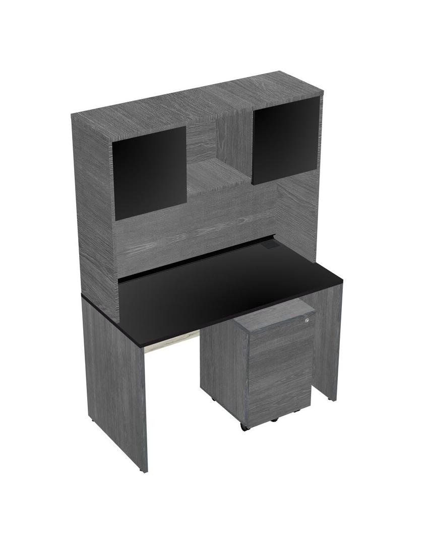 Black Rectangular Office Desk Plus Grey Wooden Mobile Drawers And Grey Hutch