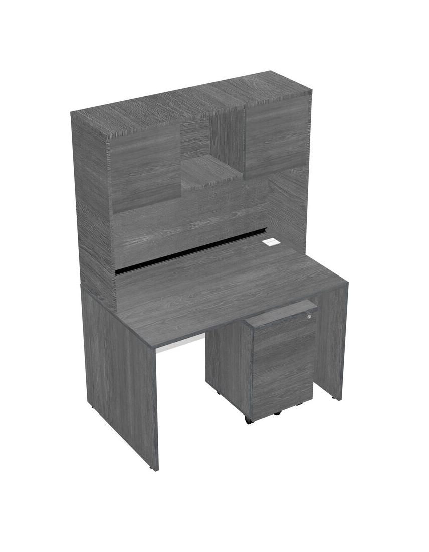 Grey Rectangular Office Desk Plus Grey Wooden Mobile Drawers And Grey Hutch