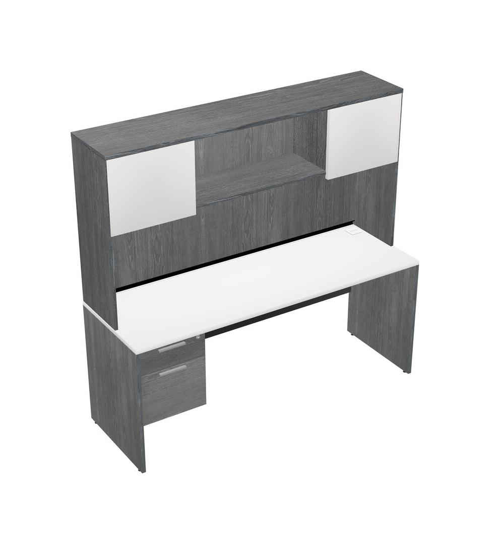 White Rectangular Office Desk Plus Grey Hanging Drawers And Grey Hutch