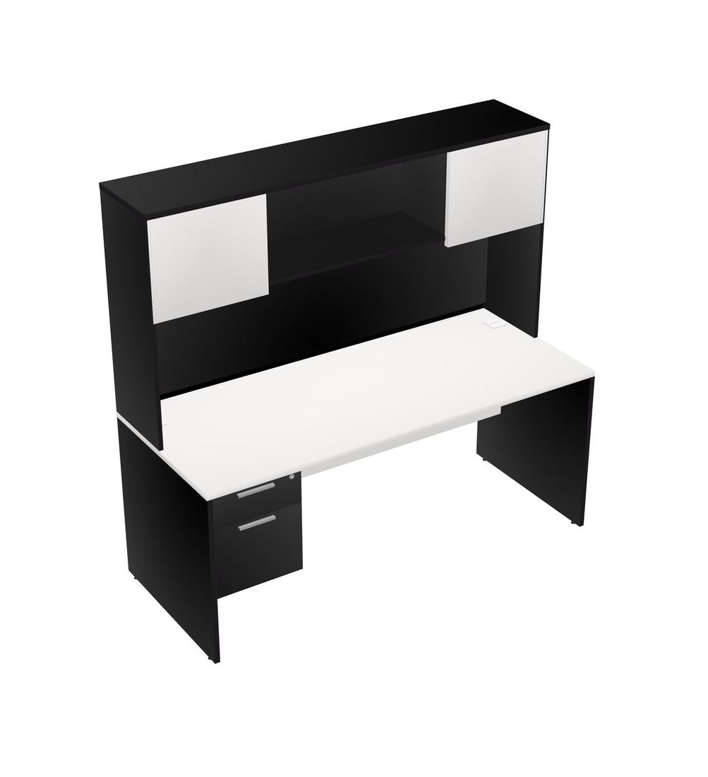 White Rectangular Office Desk Plus Black Hanging Drawers And Black Hutch
