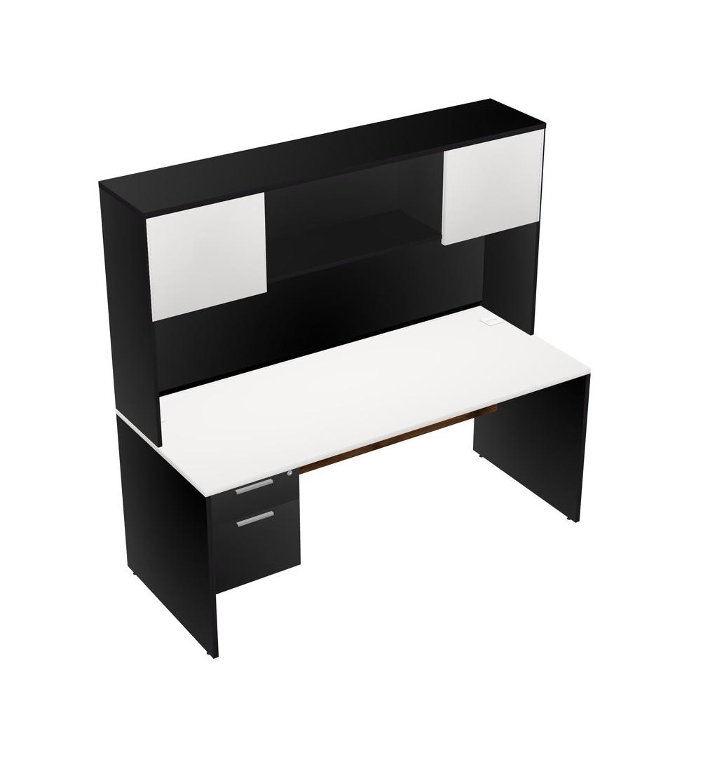 White Rectangular Office Desk Plus Black Hanging Drawers And Black Hutch