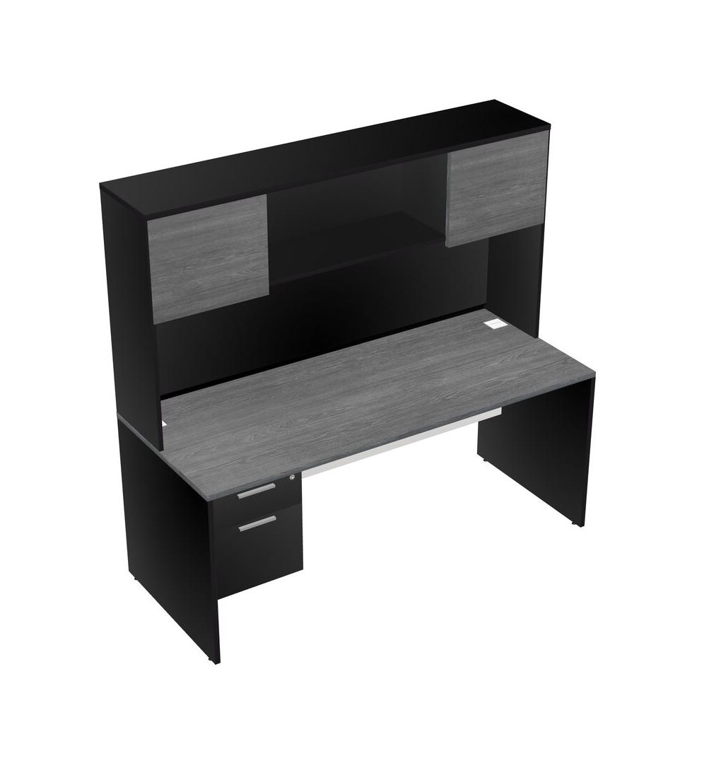 Grey Rectangular Office Desk Plus Black Hanging Drawers And Black Hutch