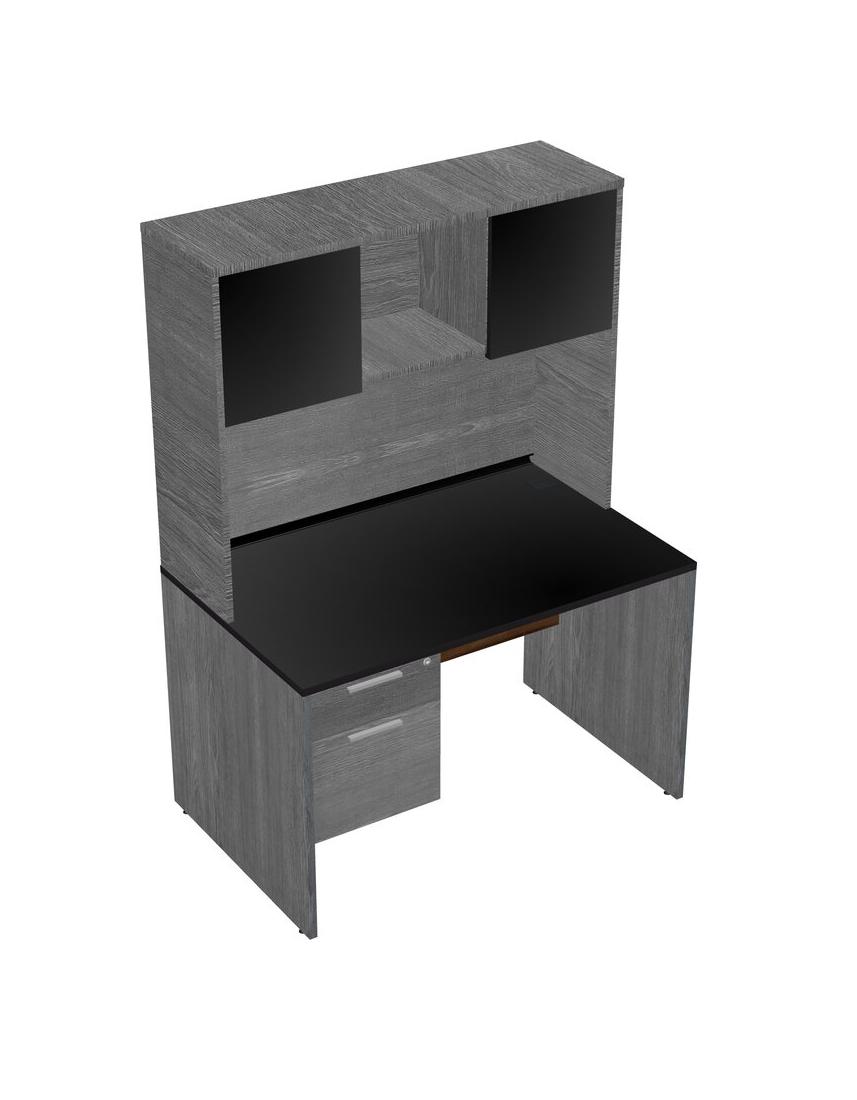 Black Rectangular Office Desk Plus Grey Hanging Drawers And Grey Hutch