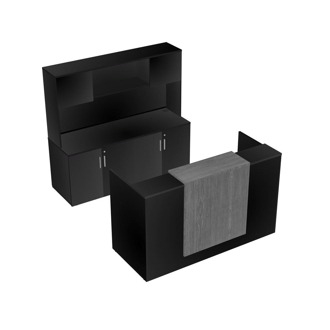Black Modular Reception Desk + Storage Cabinet Credenza + Hutch + Wooden Mobile Drawers + Floating Counter