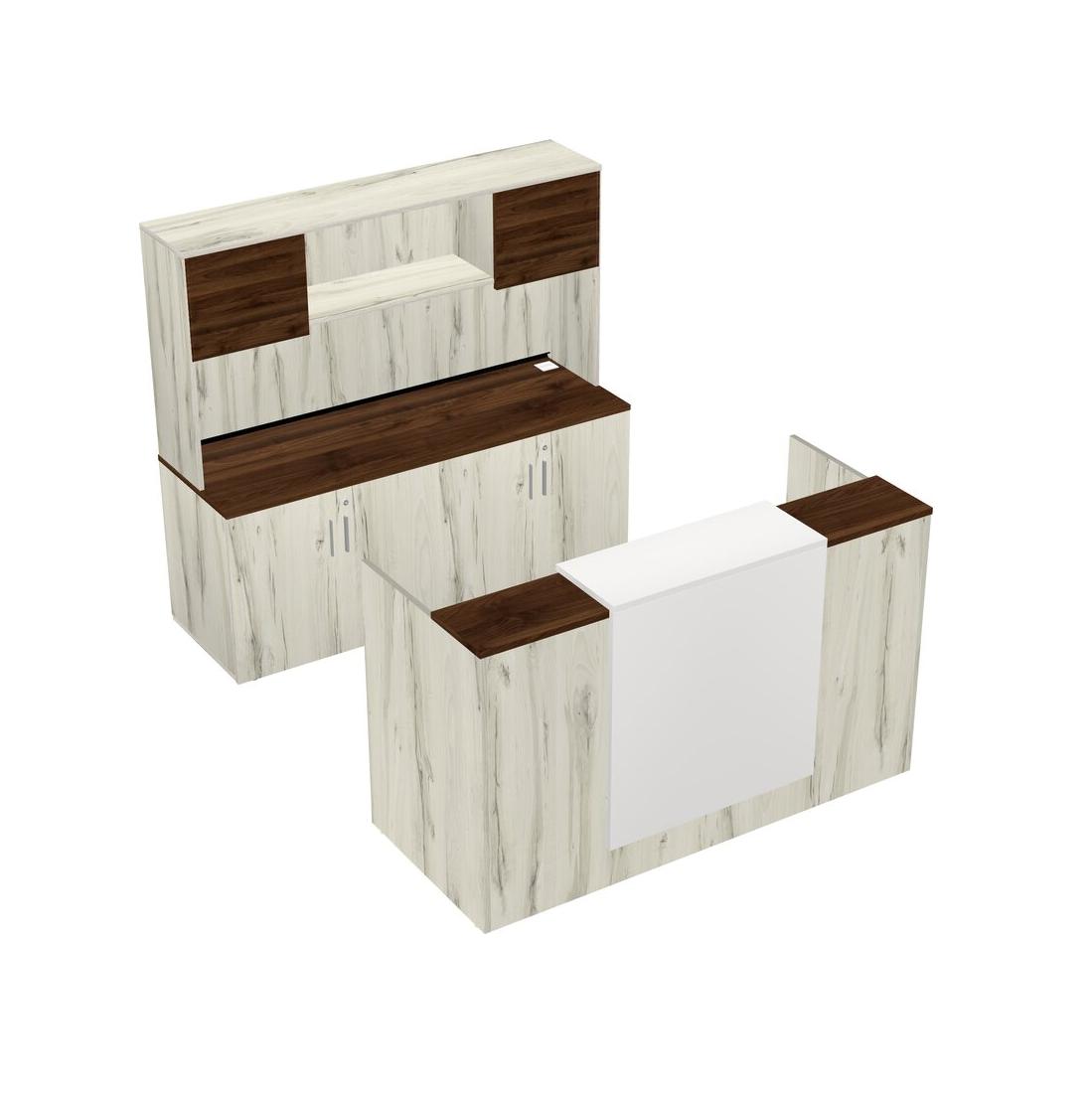 Columbia Walnut Modular Reception Desk + Storage Cabinet Credenza + Hutch + Wooden Mobile Drawers + Floating Counter