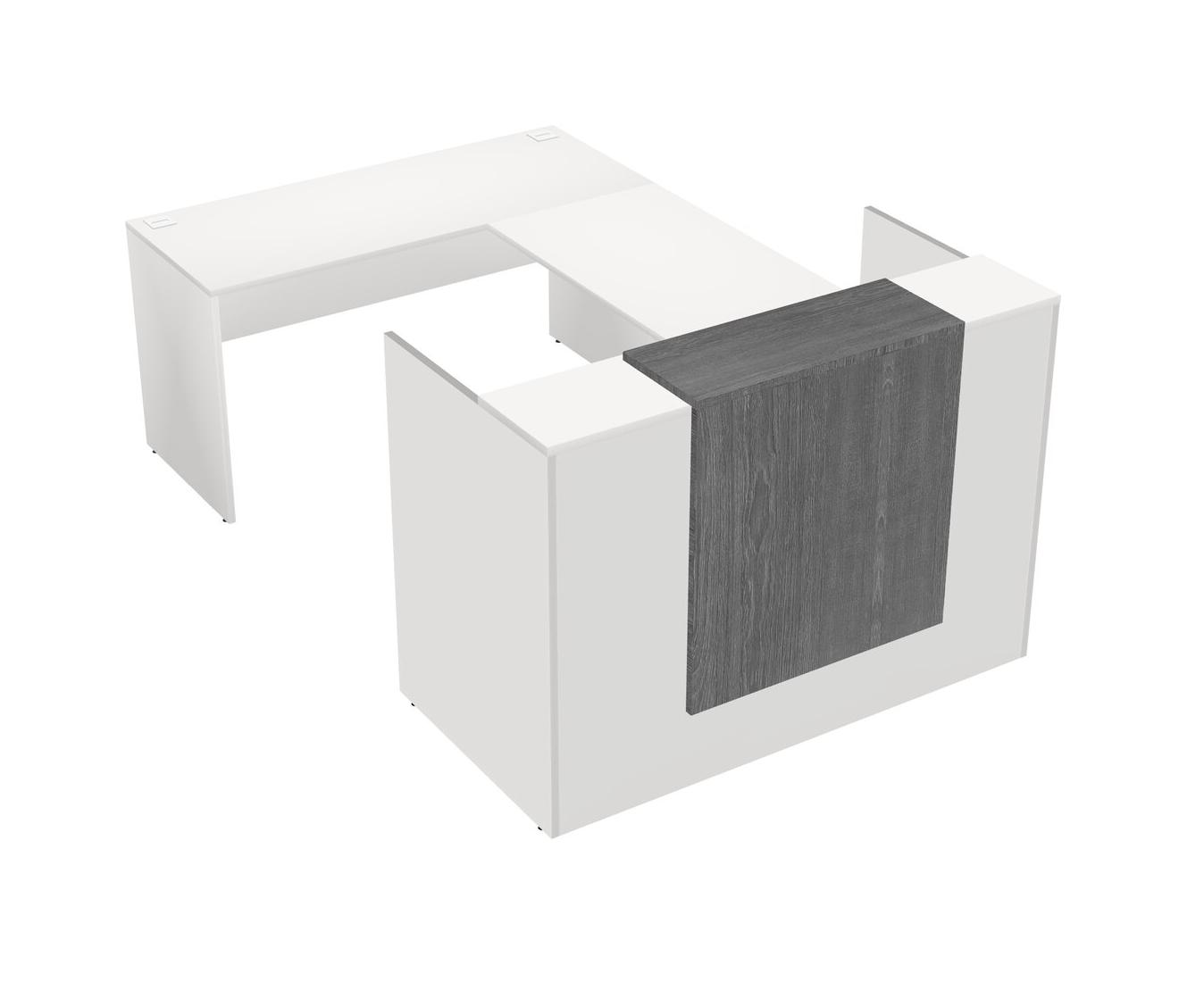 White Modular Reception Desk + Wooden Mobile Drawers + Credenza Desk + Floating Counter