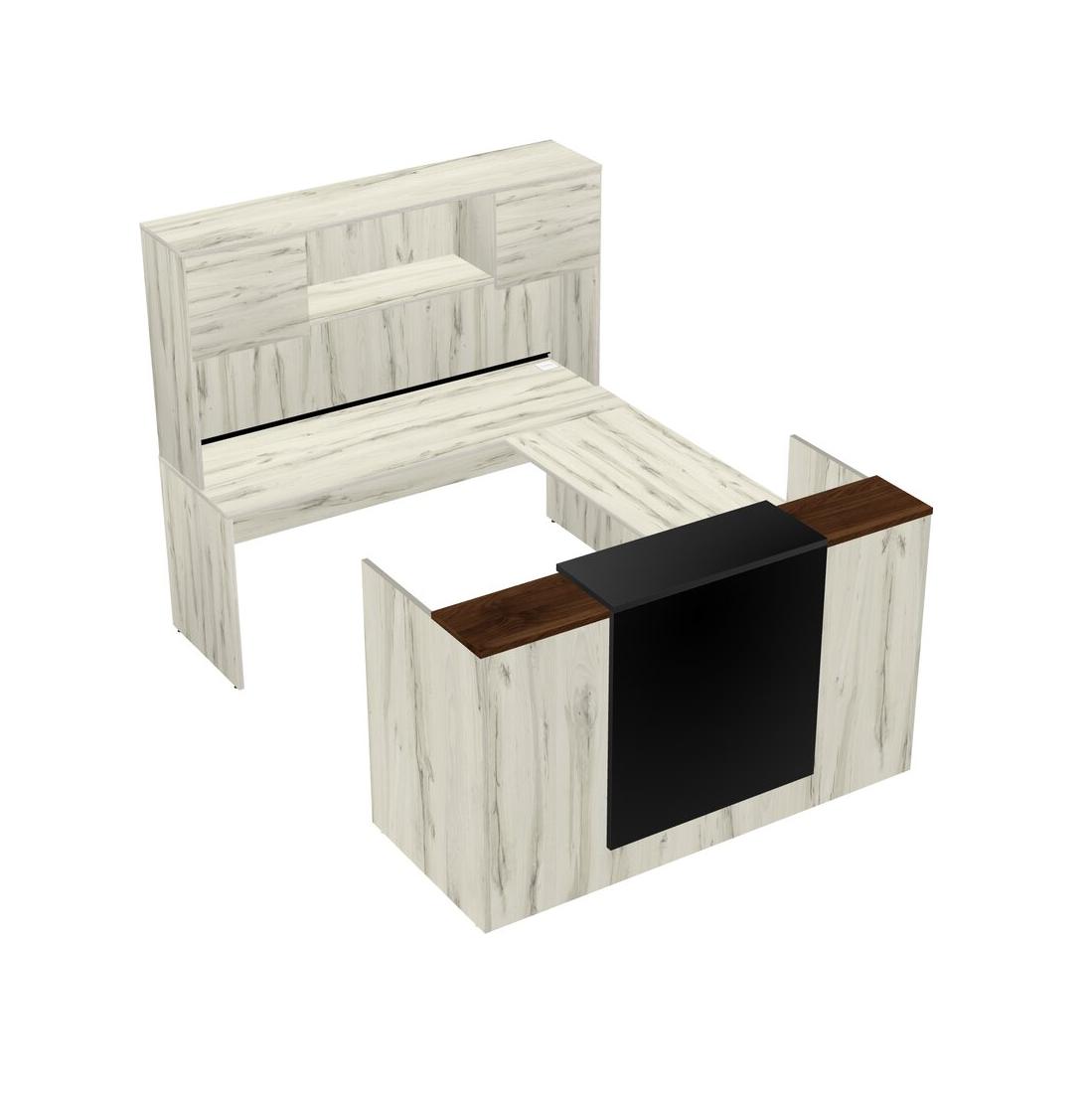 Columbia Walnut Modular Reception Desk + Wooden Mobile Drawers + Credenza Desk + Floating Counter + Hutch