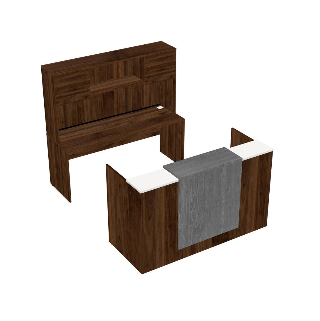 White Modular Reception Desk + Wooden Mobile Drawers + Credenza Desk + Floating Counter + Hutch