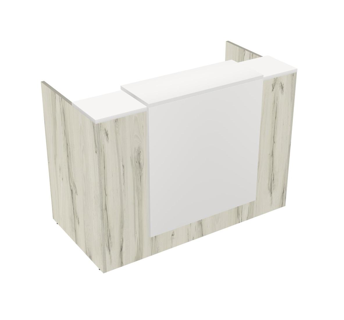 White Modular Reception Desk With Floating Counter And Wooden Mobile Drawers