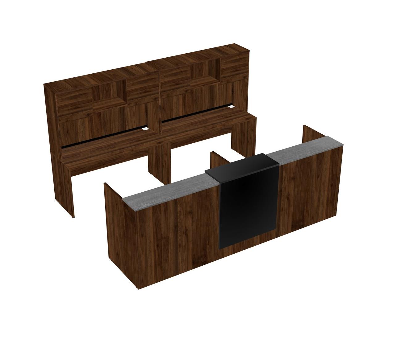 Modular Shared Reception Desk + Credenza Desk With Floating Counter + Hutch
