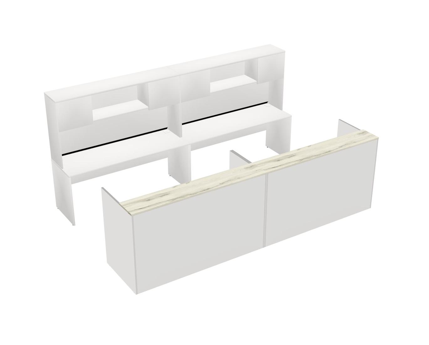 Modular Shared Reception Desk + Credenza Desk + Hutch + Wooden Mobile Drawers