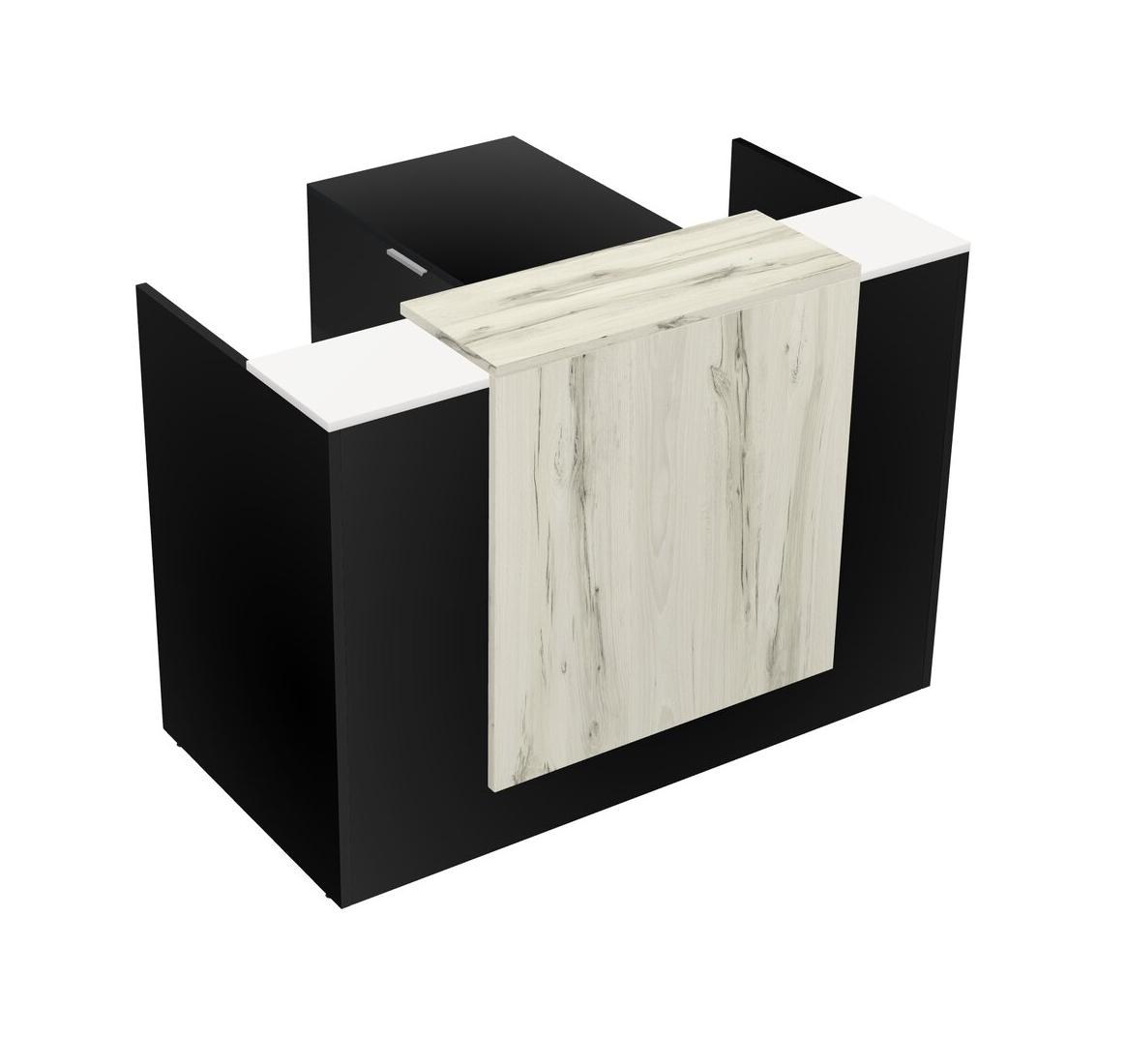 White Modular Reception Desk With Lateral Cabinet Return With Floating Counter And Wooden Mobile Drawers
