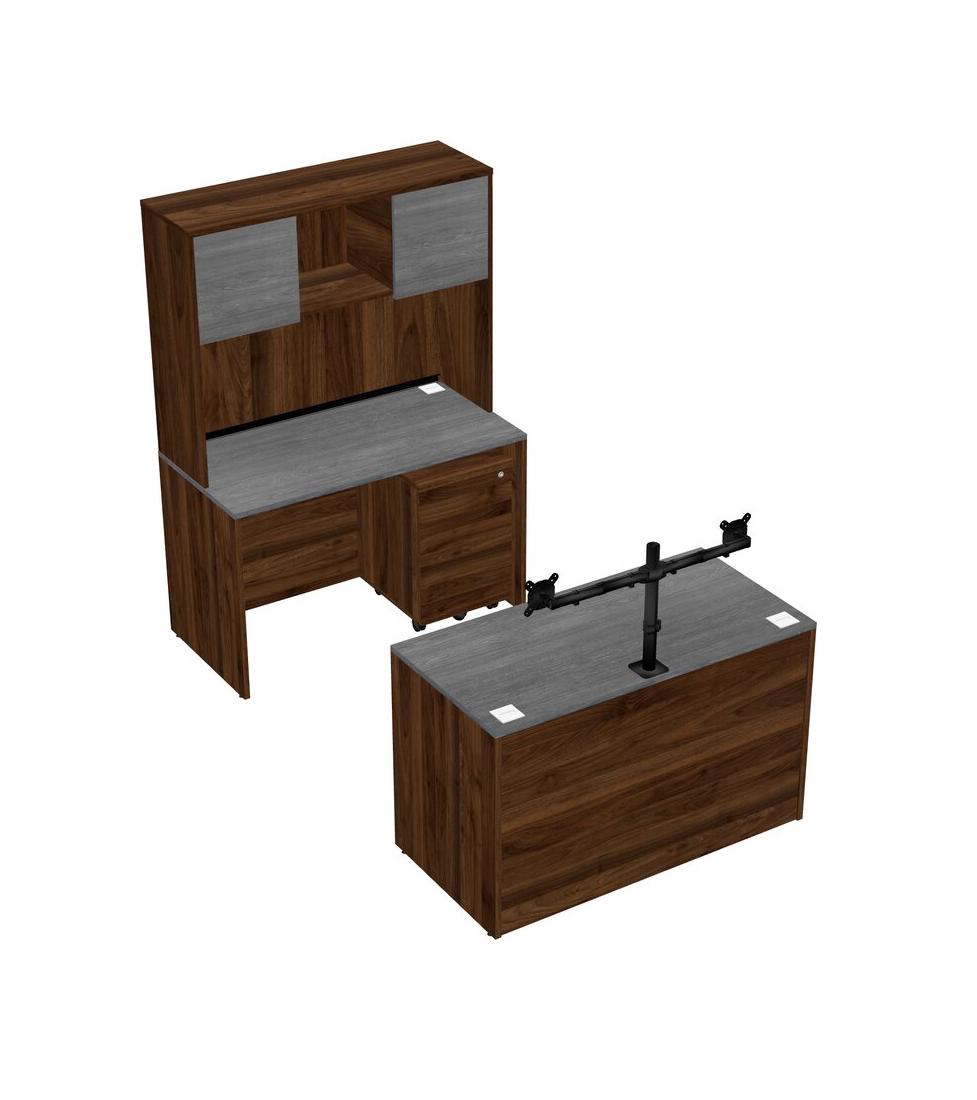 Office Parallel Desk Credenza Desk + Wooden Mobile Drawers + Hutch + Monitor Arm (double Arms)