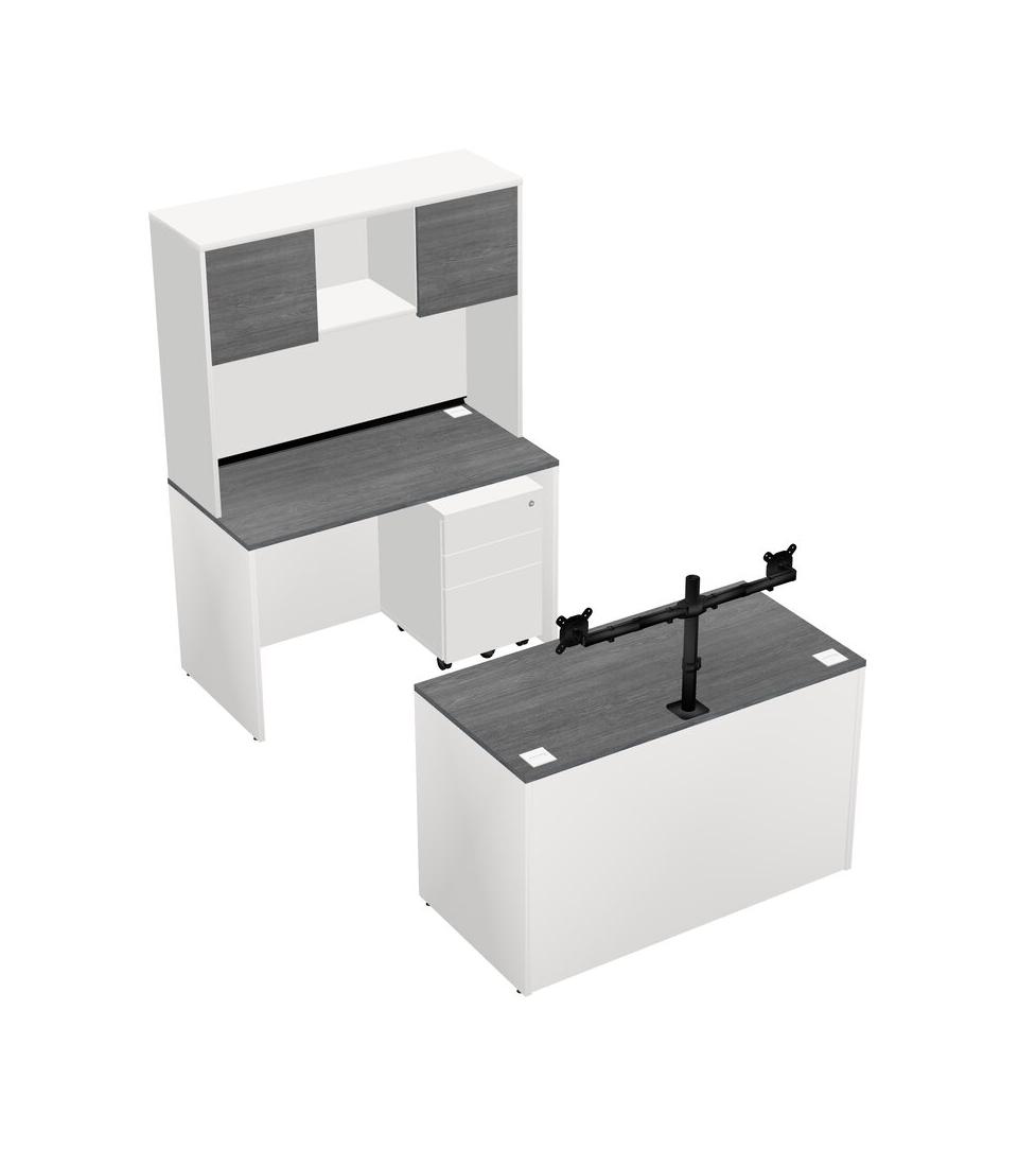 Office Parallel Desk Credenza Desk + Wooden Mobile Drawers + Hutch + Monitor Arm (double Arms)