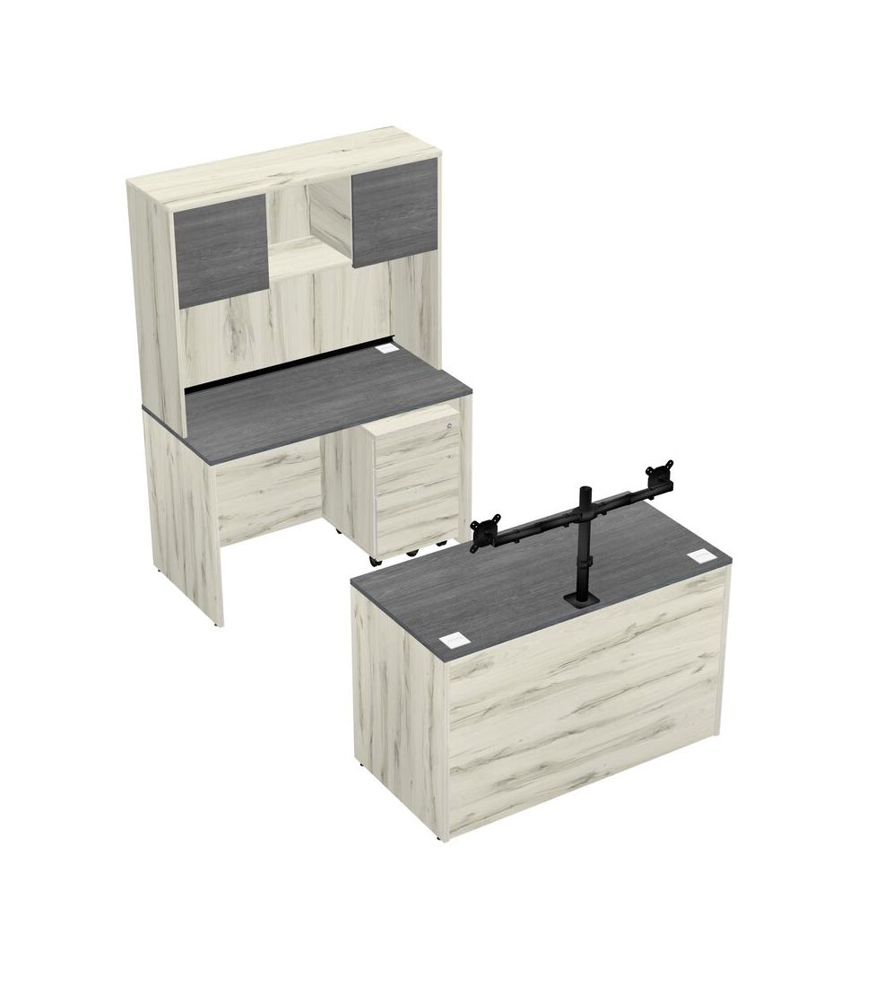 Office Parallel Desk Credenza Desk + Wooden Mobile Drawers + Hutch + Monitor Arm (double Arms)
