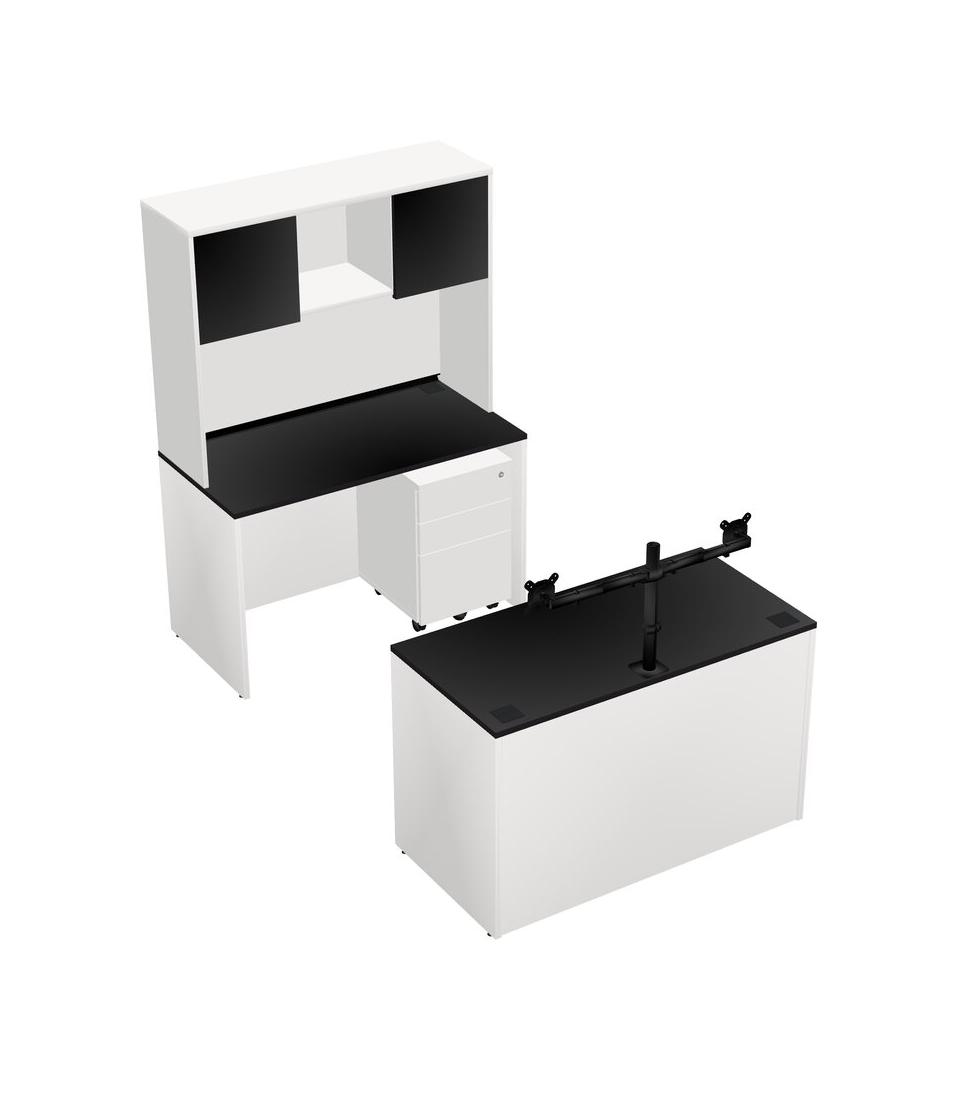 Office Parallel Desk Credenza Desk + Wooden Mobile Drawers + Hutch + Monitor Arm (double Arms)