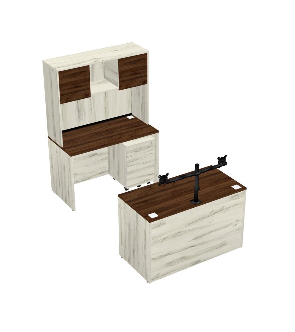 Office Parallel Desk Credenza Desk + Wooden Mobile Drawers + Hutch + Monitor Arm (double Arms)