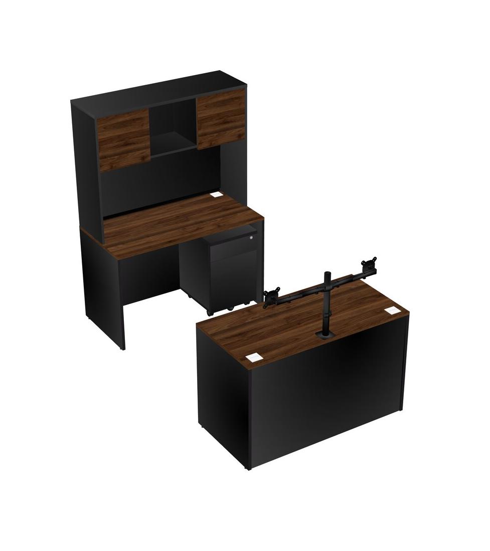 Office Parallel Desk Credenza Desk + Wooden Mobile Drawers + Hutch + Monitor Arm (double Arms)