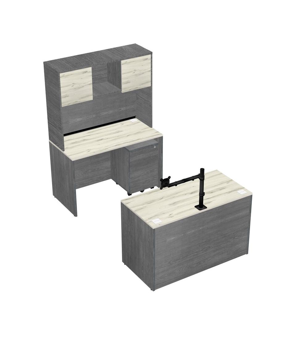 Office Parallel Desk Credenza Desk + Wooden Mobile Drawers + Hutch + Monitor Arm (single Arm)