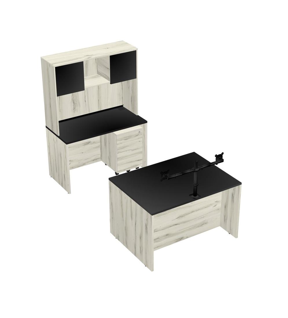 Office Parallel Desk Credenza Desk + Wooden Mobile Drawers + Hutch + Monitor Arm (double Arms)