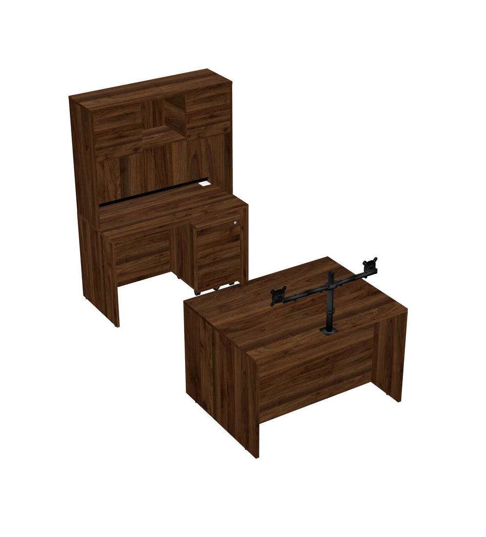 Office Parallel Desk Credenza Desk + Wooden Mobile Drawers + Hutch + Monitor Arm (double Arms)