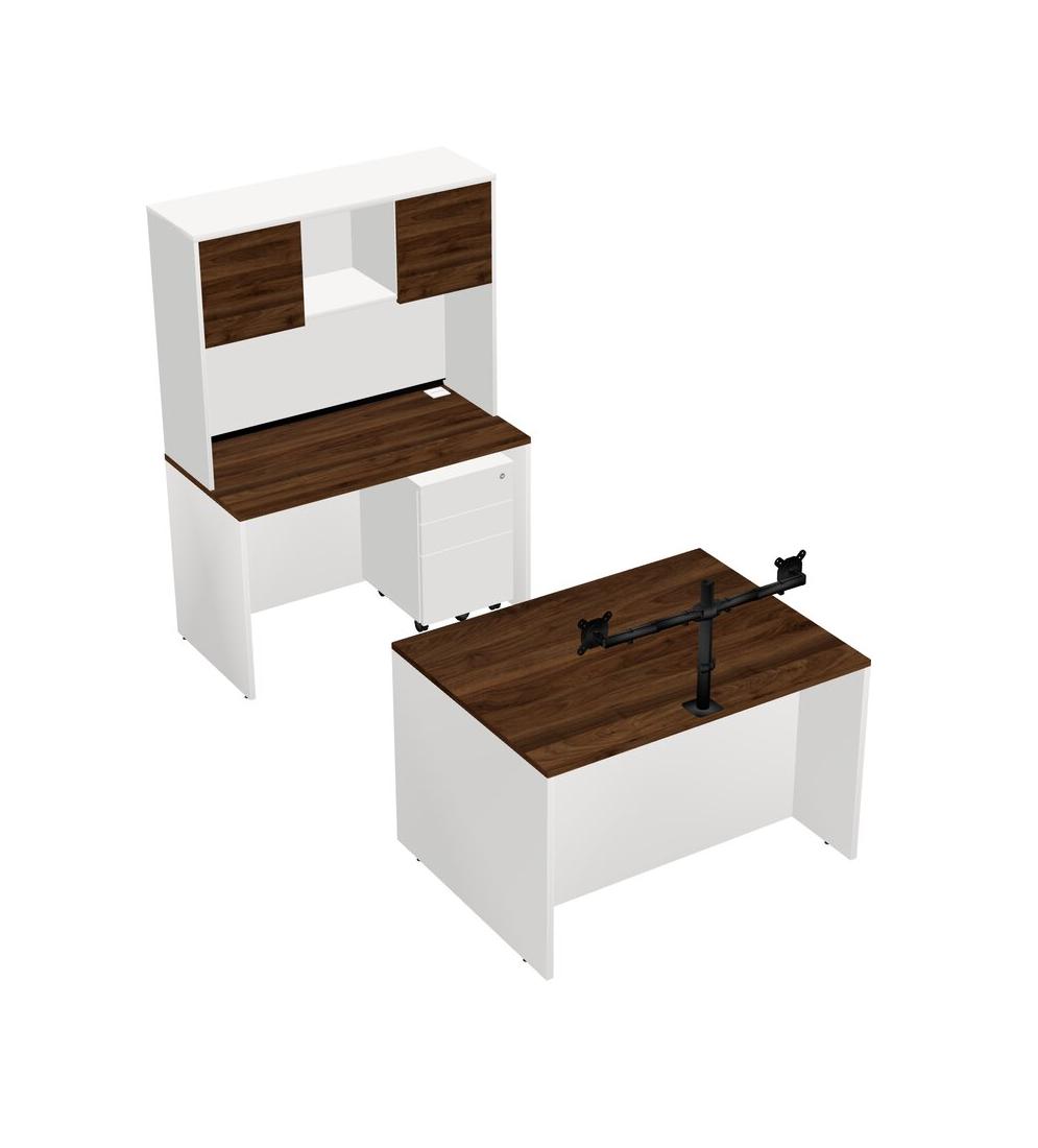 Office Parallel Desk Credenza Desk + Wooden Mobile Drawers + Hutch + Monitor Arm (double Arms)