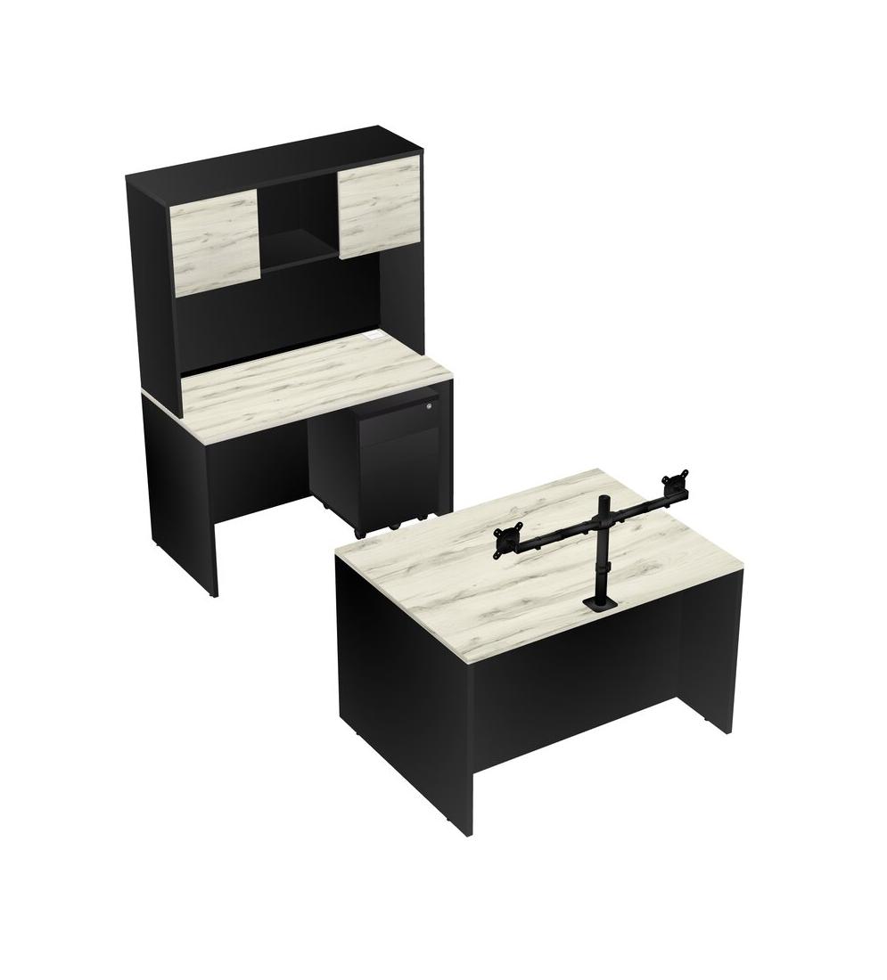 Office Parallel Desk Credenza Desk + Wooden Mobile Drawers + Hutch + Monitor Arm (double Arms)
