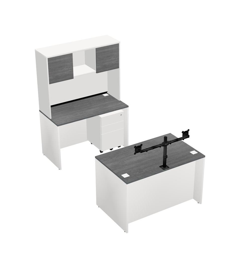 Office Parallel Desk Credenza Desk + Wooden Mobile Drawers + Hutch + Monitor Arm (double Arms)
