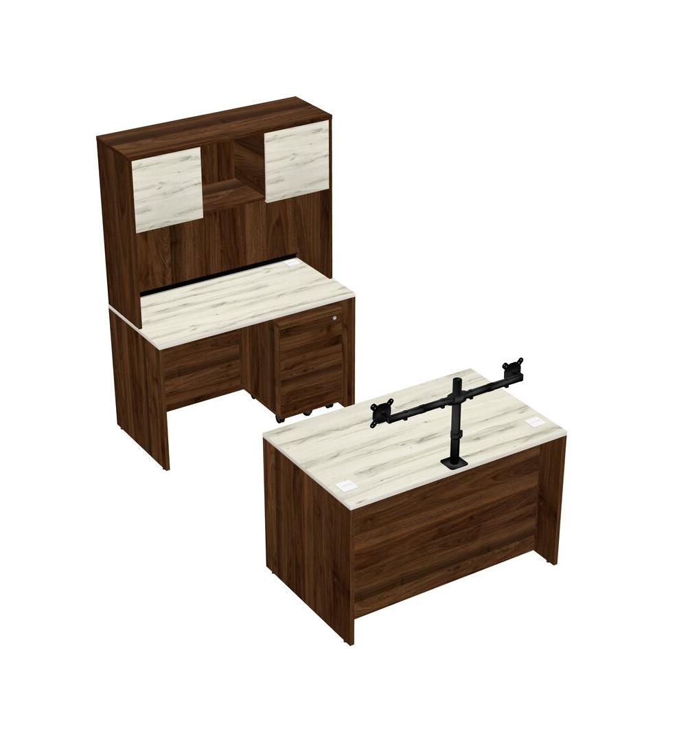 Office Parallel Desk Credenza Desk + Wooden Mobile Drawers + Hutch + Monitor Arm (double Arms)