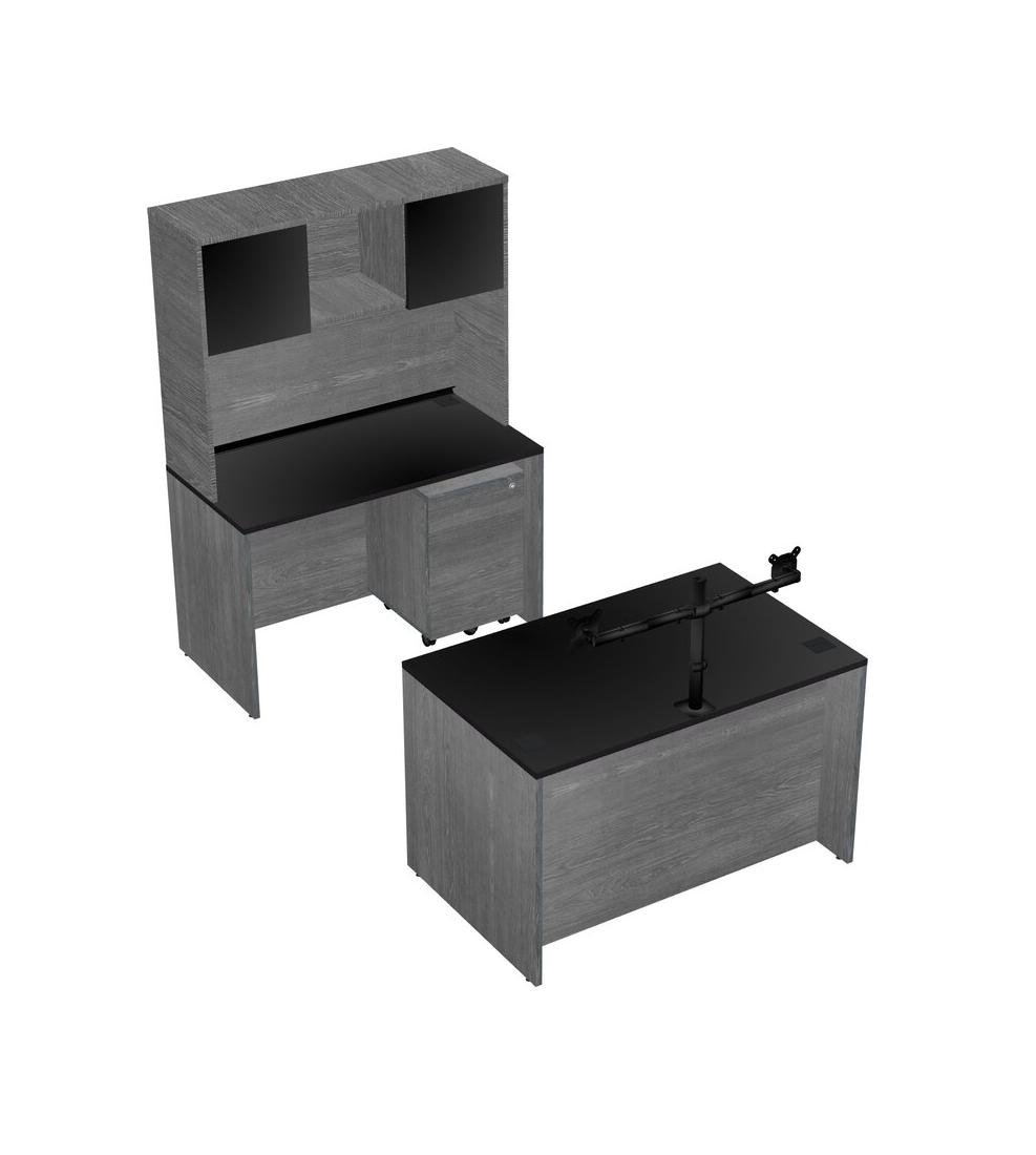 Office Parallel Desk Credenza Desk + Wooden Mobile Drawers + Hutch + Monitor Arm (double Arms)