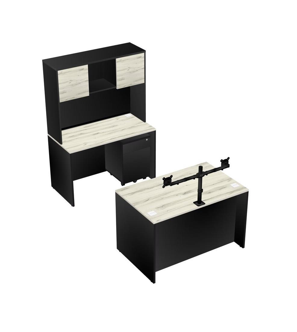 Office Parallel Desk Credenza Desk + Wooden Mobile Drawers + Hutch + Monitor Arm (double Arms)